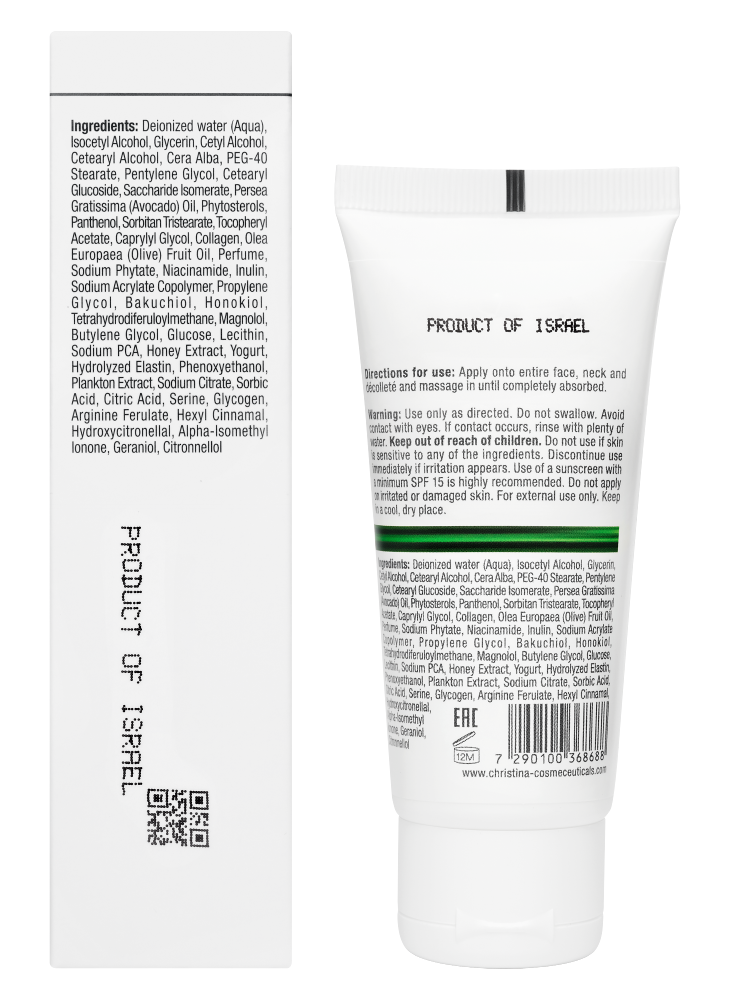 Антивозрастной комплекс с морским гидролизованным коллагеном и эластином, экстрактом меда улучшает способность удерживать влагу, оказывает моментальный лифтинг-эффект, повышает тонус и делает кожу гладкой. Бакучиол – натуральная альтернатива ретинолу – предотвращает появление морщин, осветляет пигментацию, повышает эластичность кожи. Планктонные водоросли действуют как энергетический бустер для клеток. Витамин B3 и куркумин уменьшают выраженность пигментных пятен и восстанавливает ровный тон кожи.