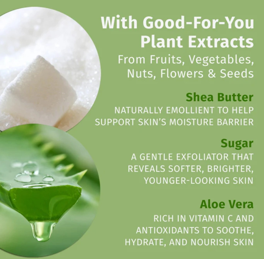 Мягкие эксфолирующие кристаллы сахара деликатно и тщательно удаляют сухую ороговевшую кожу, делая ее гладкой и нежной, при этом не нарушая гидролипидный баланс. Антиоксиданты витамины А, С и Е нейтрализуют агрессивное воздействие на кожу внешней среды. Смесь масел жожоба, масла дерева ши, семян конопли, подсолнечника и экстракт алоэ вера увлажняют, питают и кондиционируют кожу, успокаивают, охлаждают и смягчают кожу.