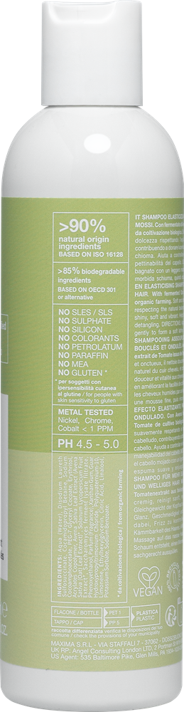 Нежная кремообразная текстура деликатно очищает волосы, не нарушая естественный баланс кожи головы. Увлажняет вьющиеся и волнистые волосы, улучшает его эластичность, придает ему мягкость, блеск и жизненную силу. Уменьшает пушистость и облегчает расчесывание. pH 4.5/5.0