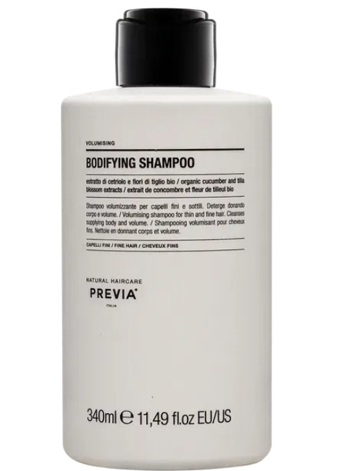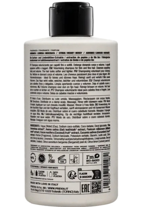 Previa Natural Haircare Volumising Bodifying Shampoo – профессиональный шампунь для тонких и редких волос, который обеспечивает деликатное очищение и придаёт волосам плотность и объём. Благодаря органическим экстрактам цветов липы и огурца волосы становятся мягкими, блестящими и более крепкими. Формула на 96% состоит из натуральных ингредиентов, полученных путём органического земледелия. Шампунь не содержит агрессивных химических веществ и компонентов животного происхождения, имеет сертификацию Eco Bio Cosmetic и Vegan Quality. Упаковка изготовлена из экологически безопасного материала PE GREEN.