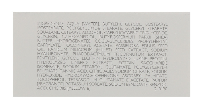 Активні компоненти: сквалан, олія ши, олія пасифлори, екстракт проса, гіалуронова кислота, екстракт мікроводорості Phaeodactylum Tricornutum, SRC-complex, таніни, пентавітін, комплекс біосахаридів, вітамін Е.