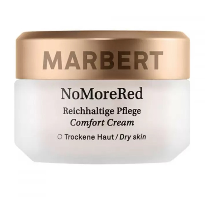 Крем для обличчя проти почервонінь та куперозу для сухої шкіри Marbert NoMoreRed Comfort Cream (Німеччина) — професійна косметика дія якої спрямована на зменшення подразнень та почервонінь на шкірі обличчя. Купероз також знизить свої прояви під час використання засобу. Завдяки активним компонентам вдається захищати дерму від впливу негативних чинників, надавати необхідного зволоження шкірі, сприяти природному сяйву та красі. Крем для обличчя створений для надання шкіряному покриву молодості завдяки антивіковим компонентам в складі. Екстракт мальви якісно впливає на подразнення зменшуючи їх та володіє чудовий anti-age ефектом, а олія календули допомагає усунути судинну сітку з обличчя.