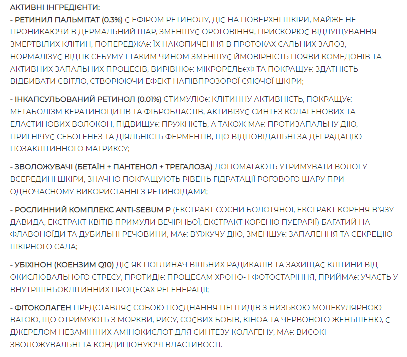 0.3% ретинил пальмітату та 0.01% чистого ретинолу інкапсульовані в наноліпосоми для пролонгованого вивільнення активних інгредієнтів в шкіру.