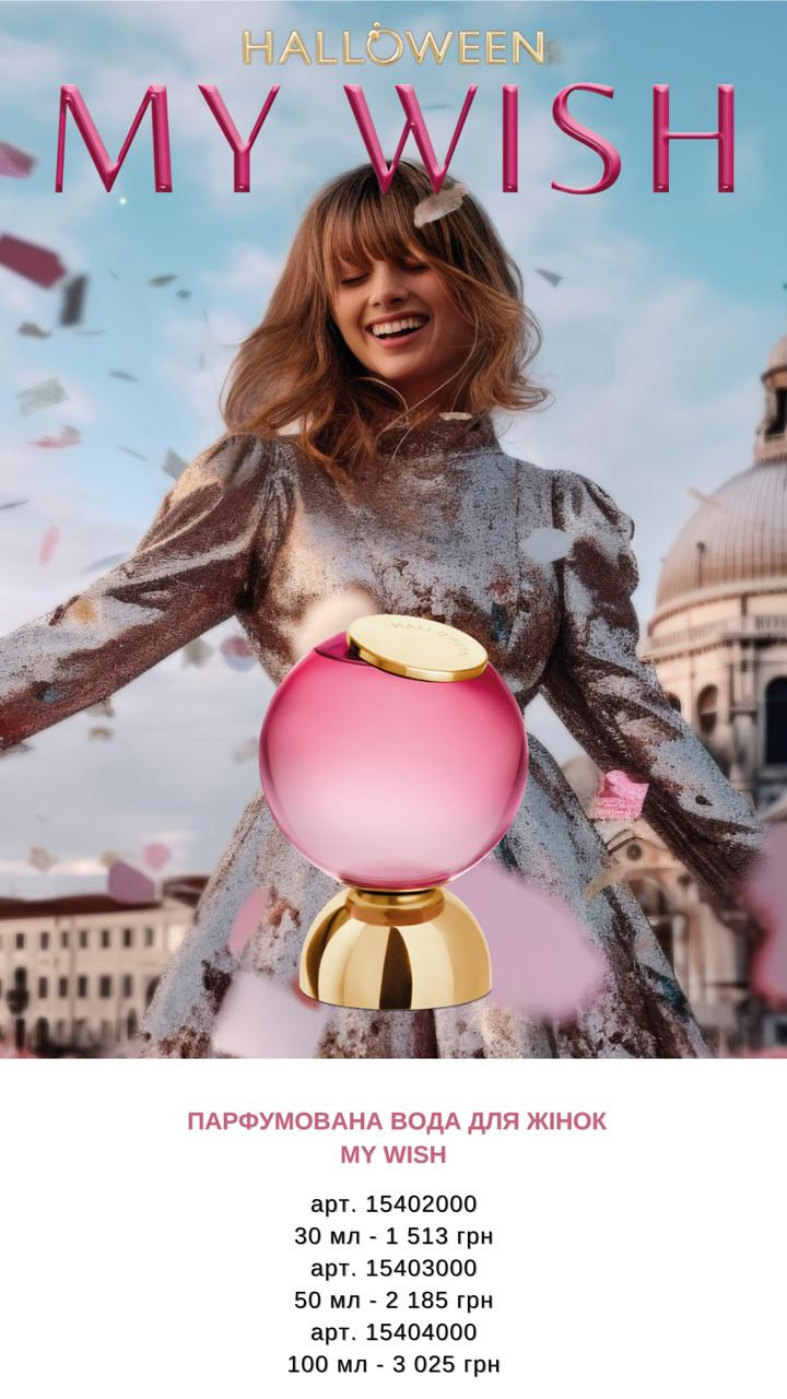 Чарівний і жіночний, My Wish відкривається нотою свіжозрізаної вишні, доповненої таємничою нотою листя фіалки і фруктовим, соковитим і природним акордом чорної смородини. У серці б'ється квітковий букет, де жасмин і гарденія привносять чуттєвий і світлий характер, який визначає цю есенцію. Серед базових нот ми знаходимо елегантну і поблажливу солону карамель, яка підсилює постійну ідею контрастів. Її супроводжують ноти моху та пачулі, які надають йому унікальний характер, чарівний стійкий.