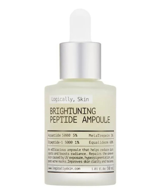 Пептидна ампула для сяйва від Logically, Skin містить у основі 4 запатентовані компоненти Акватайд 5000 - 5%, Дипептид-1 - 1%, Мелатрипін - 5%, Іквалайдерм - 60%, які комплексно працюють на покращення тону шкіри, а також її пружності та еластичності. Мелатрепін має вплив безпосередньо на меланоцити – клітини, які відповідають за вироблення пігменту (меланіну), він безпечно його розщеплює, без шкоди шкірі. Акватайд та Іквалайдерм, яким властива антиоксидантна дія, покращують тон шкіри, реагуючи на запалення на окислення, а дипептид сприяє циркуляції лімфи для покращення кольору обличчя.