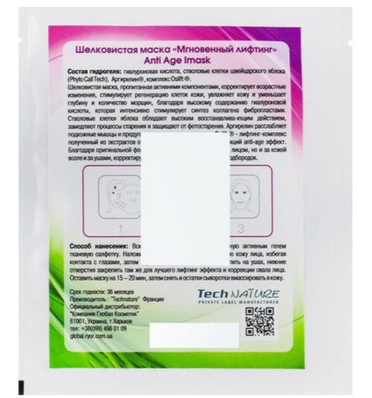 Маска вдає із себе тканинну серветку з прорізами для очей, носа, рота і вух, вміщену в пакет з гідрогелем, що складається з: гіалуронової кислоти, стовбурових клітин швейцарського яблука (Phyto Call Tech), Аргірелін®. Завдяки оригінальній формі, маска доглядає не тільки за обличчям, але і за шкірою біля і за вухами, коригує овал обличчя, підтягує друге підборіддя. Шовковиста маска, просочена активними компонентами, коригує вікові зміни, стимулює регенерацію клітин шкіри, зволожує шкіру і зменшує глибину і кількість зморшок, завдяки високому вмісту гіалуронової кислоти, яка інтенсивно стимулює синтез колагену фібропластов. Стовбурові клітини яблука мають високим відновлює дію, уповільнюють процеси старіння і захищають від фотостаріння. Аргірелін ®; розслабляє підшкірні м'язи і попереджає поява зморшок.