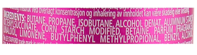 Butane, Propane, Isobutane, Alcohol Denat, Aluminium Starch Octenylsuccinate, Corn Starch.