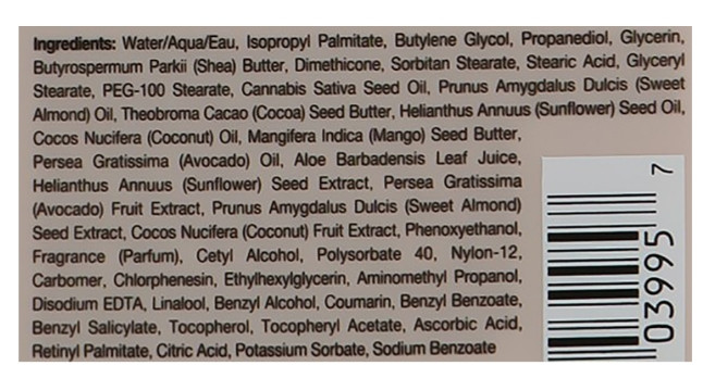 Активні компоненти: олія насіння конопель, олія мигдалю, олія какао, олія авокадо, алое віра, олія кокосу, олія ши, олія соняшника.