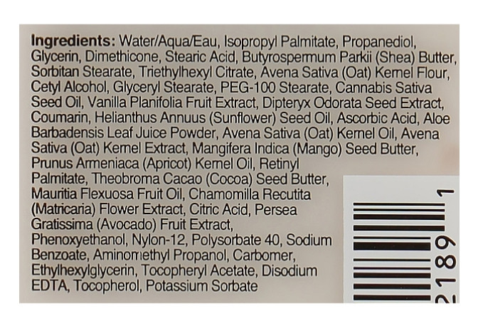 Активні компоненти: олія та екстракт насіння конопель, заспокійливий комплекс на основі вівса, алое віра, вітамін Е, олія манго, олія какао, олія ши.