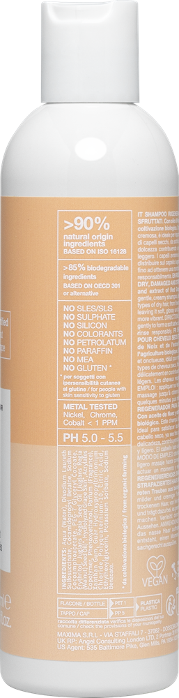- биоожиженный красный виноград: обеспечивает волосам питание, укрепляет его и придает блеск. Действует как мощный антиоксидант, увлажняет волосы и кожу головы, поддерживая их в здоровом состоянии. Улучшает внешний вид волос благодаря своим антивозрастным свойствам.