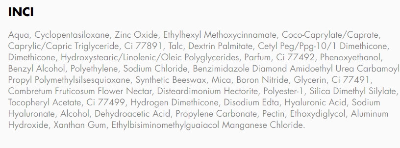 Наполовину лечение, наполовину макияж. Благодаря легкой текстуре, которую можно наносить, он бережно адаптируется к цвету любого цвета лица. Идеальный оттенок кожи для эффекта макияжа «без макияжа», естественного и сияющего. С одной стороны, увлажняет, осветляет, уменьшает видимость морщин и защищает кожу от солнечных лучей, а с другой – разглаживает текстуру лица, выравнивает цвет лица и скрывает мелкие недостатки. Внутри инкапсулированные пигменты, которые постепенно выделяют цвет во время нанесения, в сочетании с адамантиновыми микросферами для мерцающего эффекта на коже, гиалуроновой кислотой и NutriNectar, сладким нектаром с питательными и регенерирующими свойствами.