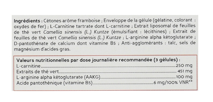 Добавка дієтична у формі капсул для схуднення. На основі екстракт зеленого чаю, L-аргініну альфа-кетоглутарату (AAKG), L-карнітину та вітаміну B5.
