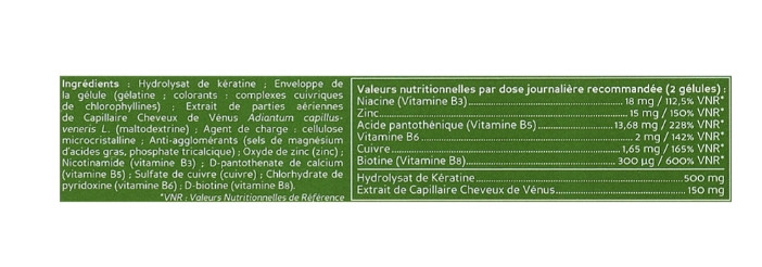 Содержит натуральный кератин и папоротник Maindenhair, связанные с витаминами и минералами. Это биологически активная добавка на основе кератина и папоротника с доказанной эффективностью. Keratine Forte действует непосредственно в сердце капиллярной луковицы, обеспечивая доказанную эффективность. Особенно рекомендуется для людей, которые хотят предотвратить выпадение волос и улучшить стойкость и красоту своих волос.