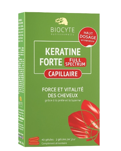Кератин является основным компонентом волос (от 80 до 95%). Он естественным образом содержит 17 основных незаменимых аминокислот. Biocyte Keratine Forte Full Spectrum содержит 17 основных аминокислот, входящих в состав кератина, включая оптимальную цистина (в 3,5 раза более концентрированный). Экстракт люцерны (люцерны), содержащийся в формуле, придает волосам жизненную силу и здоровье, а экстракт хвоща укрепляет их.