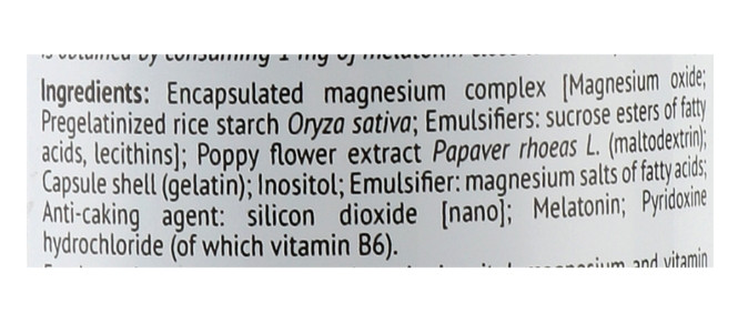 Мелатонін сприяє скороченню часу, необхідного для засинання (сприятливий ефект досягається при споживанні 1 мг мелатоніну перед сном). Магній і вітамін В6 сприяють нормальній психологічній функції, наприклад, стійкості до стресу