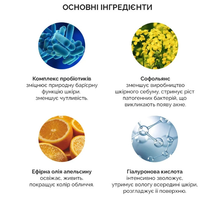 Вспенивающая основа средства — омыленные жирные кислоты и мягкий ПАВ лаурил бетаин, в комплексе они дают глубокое очищение от излишнего себума, мельчайших частичек пыли и омертвевших клеток рогового слоя, которые могут стать причиной воспалений. За счет присутствия в составе пенки увлажняющих добавок, которые являются компонентами натурального увлажняющего фактора, кожа лучше удерживает влагу, увеличивается прочность эпидермального барьера, снижается чрезмерное воздействие моющих агентов на гидролипидную мантию кожи. Антимикробный актив натурального происхождения Софольянс С борется с причинами воспалений и повышенной секрецией сальных желез, а комплекс из 5 видов пробиотиков восстанавливает естественную микрофлору кожи.