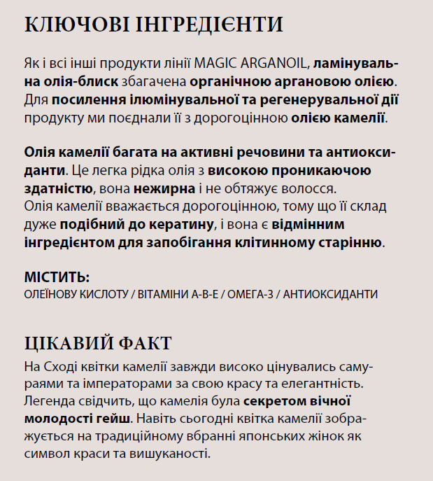 Ламинировочное масло идеально для тонких истощенных волос, поврежденных химической обработкой и неблагоприятными атмосферными воздействиями. После окрашивания и осветления волосы возвращают свой блеск и эластичность.