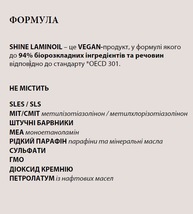 SHINE LAMINOIL ПОДХОДИТ ДЛЯ ВСЕХ ТИПОВ ВОЛОС. Однако она особенно рекомендована для пушистых тусклых волос, лишенных блеска. На коричневых или темных волосах результат будет удивительным, потому что зеркальный эффект будет более выраженным и броским.