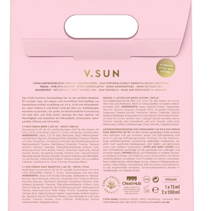 V.Sun - солнцезащитный крем для тела премиум класса (фактор защиты от солнца 50) с эктоином и витамином Е. Легкий комфортный крем обеспечивает надежную защиту от ультрафиолетовых лучей, а также отлично защищает от солнечных ожогов. Масло ши и алоэ вера увлажняют кожу, а также предупреждает потерю влаги, вызванную действием солнечных лучей. Крем с нейтральным ароматом имеет легкую текстуру, быстро впитывается, не оставляя неприятного липкого остатка. Подходит для чувствительной к солнцу кожи. Формула, благоприятная для кораллов и не содержит ингредиентов, препятствующих их росту.