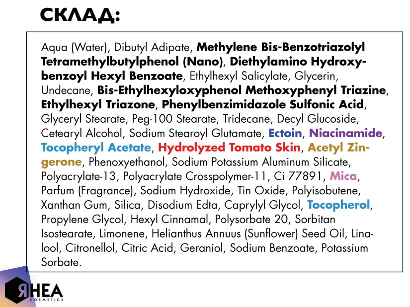 Кремовидная увлажняющая и омолаживающая эмульсия с фотозащитой, идеально подходит для ежедневной защиты кожи от городской агрессии, которая может нарушить кожный барьер, вызывая преждевременное старение и делая ее менее сияющей. Это мультизащитное средство защищает как от вредных солнечных лучей UVA/UVB, так и от интенсивного синего света, излучаемого искусственными источниками, экранами компьютеров и смартфонов Кроме того, благодаря антиоксидантным и регенерирующим свойствам специальных активных веществ, таких как Radical Shield, гидролизованный экстракт томатов и ниацинамид, он защищает кожу от всех городских стрессов, которым она подвергается ежедневно, таких как загрязненный воздух, сигаретный дым, тяжелые металлы и неблагоприятные погодные условия, предотвращая обесцвечивание и делает цвет лица сияющим и ровным. Функциональные активные вещества Химические фильтры: Молекулы, которые могут выборочно поглощать ультрафиолетовую энергию. излучение и рассеивать обезвреживая ее. Они имитируют механизм действия меланина, т.е. эффективно поглощают электромагнитную энергию, возвращая ее в виде другой энергии. Физические фильтры: Частицы, создающие экран против ультрафиолетового излучения в результате процесса преломления. Они состоят в основном из минералов, таких как оксид цинка и титана. Термин "экран" указывает на то, что эти вещества являются настоящим барьером против радиации. Эти типы защитных средств рассеивают излучение и не пропускают ультрафиолетовые лучи, но они отражают их. Система Age Integrity: Многоцелевое антивозрастное средство, останавливающее старение и противодействующее появлению ключевых признаков фотоповреждения кожи. Предотвращает повреждение ДНК и повышает способность кожи поддерживать целостность белков внеклеточного матрикса для оптимального здоровье и внешний вид. Осветительная пудра: Порошок с сияющим эффектом, полученный из слюды, рыхлого минерала кристаллического вида, обладающего люминесцентными и отражающими свет свойствами. Токоферол: Витамин Е, предотвращает реакцию окисления и действует как биологический антиоксидант. В частности, в организме человека токоферол является основным жирорастворимым антиоксидантом, который защищает от окислительного стресса и свободных радикалов. Ниацинамид: Оказывает иммуностимулирующее, антиоксидантное и уплотняющее действие, стимулируя сцепление клеток для усиления защиты кожи. Ниацинамид также эффективно стимулирует действие фибробластов, тем самым повышает уровень коллагена и эластина, одновременно предоставляя антигликационное действие, предотвращая склеротизацию коллагеновых волокон. Гидролизованный экстракт томата: Богат полифенолами, сахарами и ликопином с высокой проникающей способностью, особенно функциональный (в два раза эффективнее более известного (бета-каротина) в защите фибробластов, подвергающихся чрезмерному воздействию ультрафиолетовых лучей. В дополнение к своим сильным антиоксидантным свойствам, экстракт томатов также может обеспечить защиту от тяжелых металлов, сохраняя целостность ДНК от загрязняющих факторов окружающей среды.