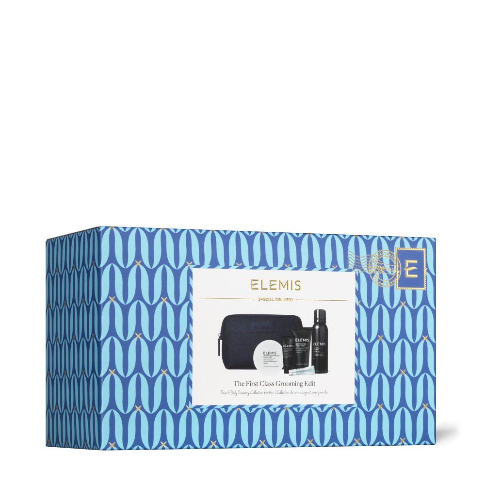 Почувствуйте Первый класс в рутине ухода за кожей лица для мужчин с пятью основными продуктами представленными в эксклюзивной дорожной косметичке ELEMIS, нацеленной на очищение, эксфолиацию, увлажнение и обеспечение гладкости и молодости кожи.
