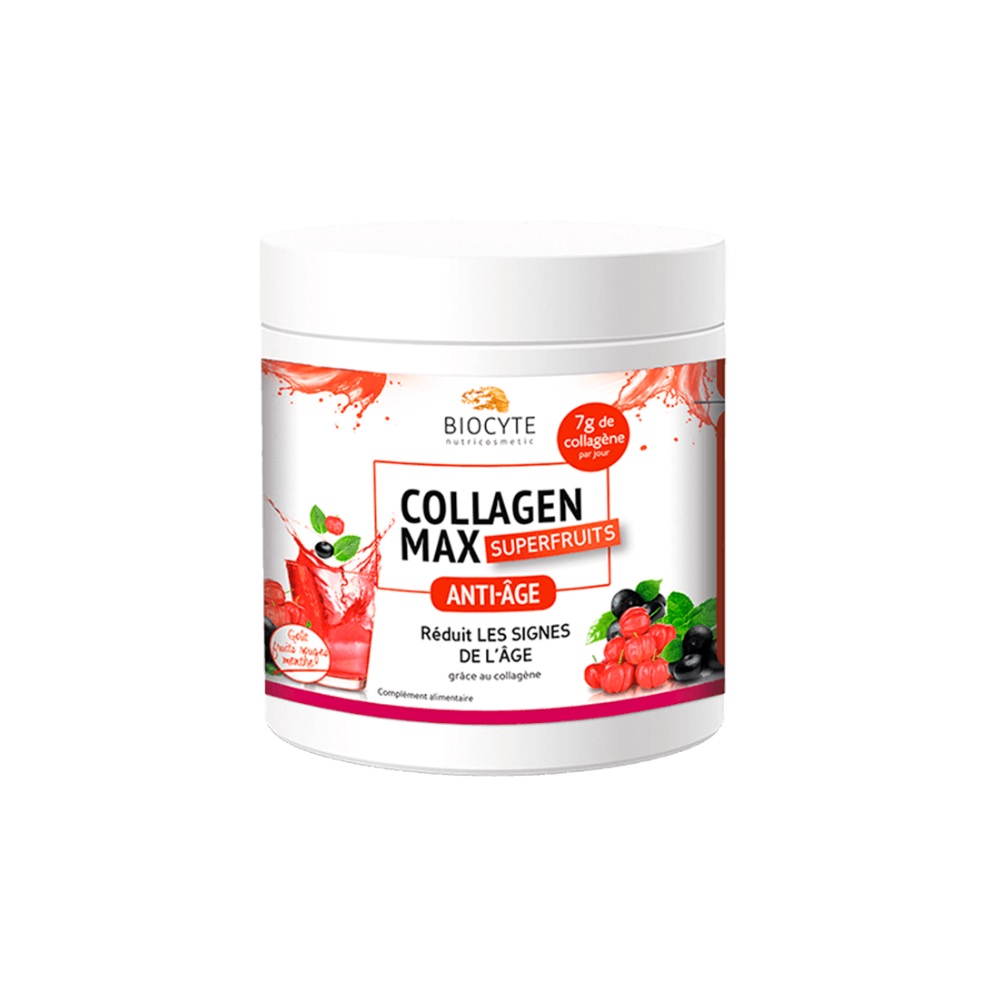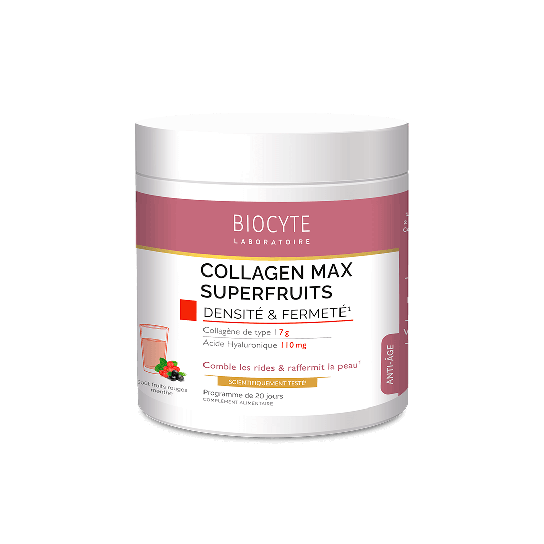 Пищевая добавка со вкусом ягод и мяты препятствует старению и разглаживает уже возникшие морщины. Со временем выработка коллагена значительно снижается. Кожа разрыхляется и теряет свою плотность – появляются морщины: это первые видимые признаки старения. Компания «Biocyte» является экспертом по нутрикосметике, которая разработала коллаген по имени «Max Superfruits». Это содержит гидролизованный коллаген высокой концентрации (7 г), экстракт асаиека и порошок ацеролы. Витамин С в составе ацерола способствует образованию коллагена для обеспечения нормальной функции кожи.
