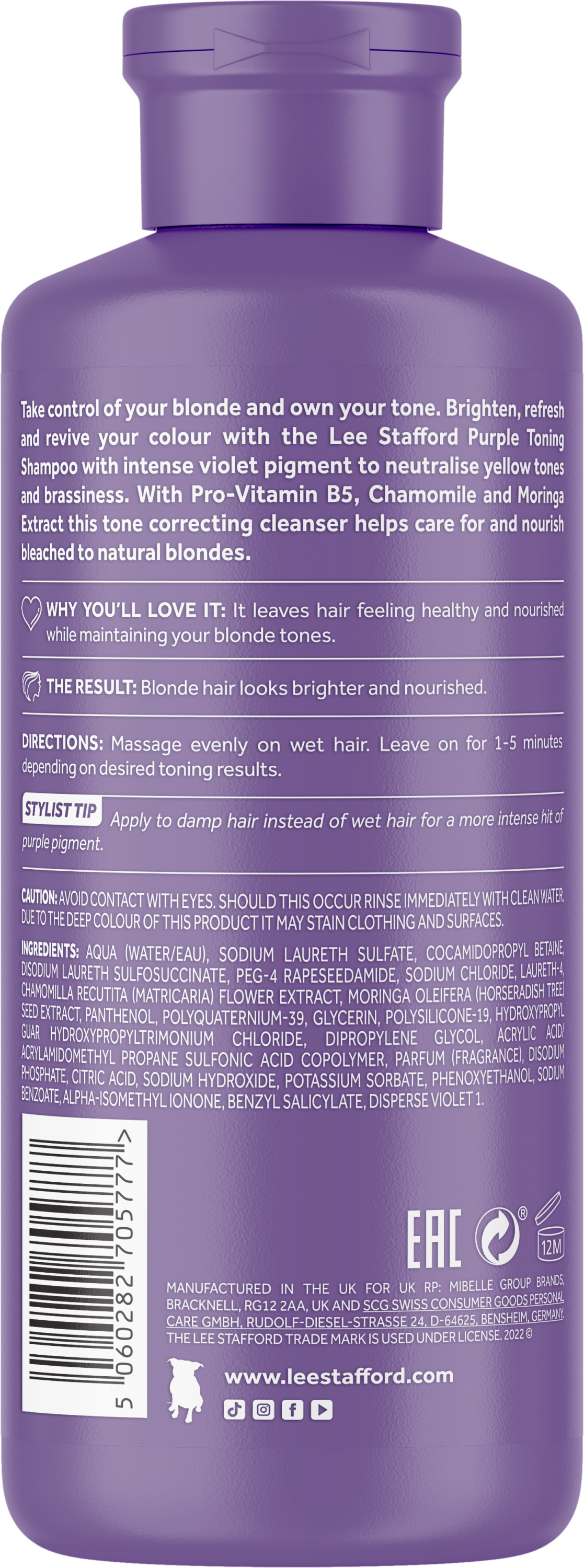 Разработанный специально для обесцвеченных, мелированных, натуральных светло-русых или мелированных волос, вы можете использовать этот шампунь вместе с фиолетовым тонирующим кондиционером Lee Stafford Purple Toning Conditioner для удвоения тонизирующего действия.