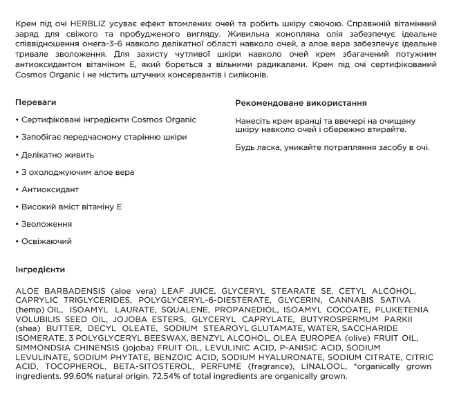 Усталость, стрессы, постоянное недосыпание всегда сказываются именно на зоне век. Поэтому появляются отечность, темные круги, а морщинки становятся более видимыми всем, визуально добавляя возраст. Чтобы вернуть красоту, свежесть и молодость чувствительному эпидермису, выбирайте сыворотку для зоны вокруг глаз от бренда Herbliz. При регулярном применении средство позволит вам попрощаться с надоедливыми «гусиными кавычками» и сеткой тонких линий, обретая естественное сияние, шелковистость и подтянутость. Уже при первом использовании уникальный ингредиент Easyliance обеспечивает мгновенный лифтинг эффект, смягчая стрессовую кожу, осветляя темные круги и визуально сглаживая морщинки.
