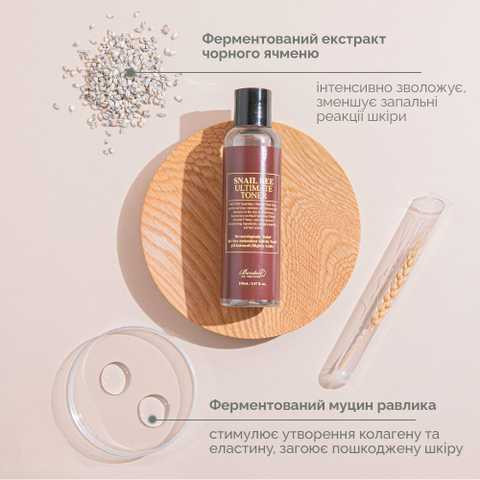 В состав тонера входит 40% ферментированного муцина улитки с высоким содержанием биологически активных веществ, которые увлажняют, питают кожу, а также помогают бороться с несовершенствами и первыми возрастными изменениями: