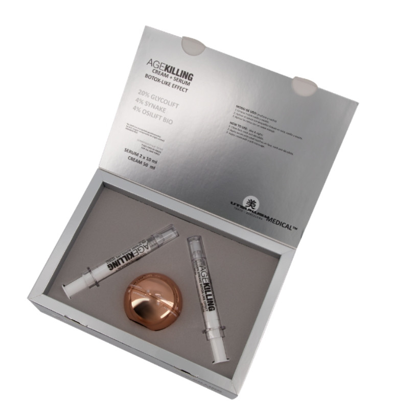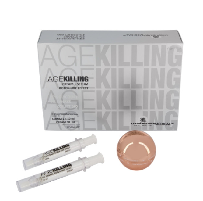 При застосуванні комплексу Age Killing помітно зменшуються м’язові скорочення, завдяки чому зменшується кількість та глибина зморшок, а формування нових зморшок сповільнюється на тривалий період. Крем та сироватка відновлюють пружність та щільність шкіри, посилюють ефект від попередніх ін’єкцій.