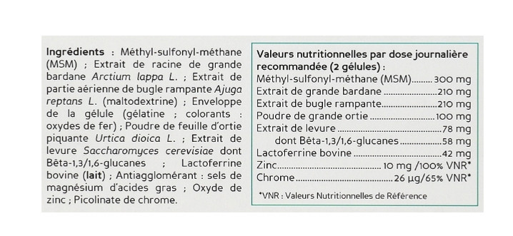 Склад: Метилсульфонілметан (МСМ), екстракт кореня великого лопуха (Arctium Lappa), оболонка капсули (желатин, барвник: діоксид титану), екстракт повзучого горнуха (Ajuga Reptans), порошок з листя великої кропиви (Urtica Dioica), Cerkt включаючи бета-глюкан, мальтодекстрин, бичачий лактоферин (емульсія): солі магнію жирних кислот, оксид цинку, засіб проти стеження: діоксид кремнію, піколінат хрому.