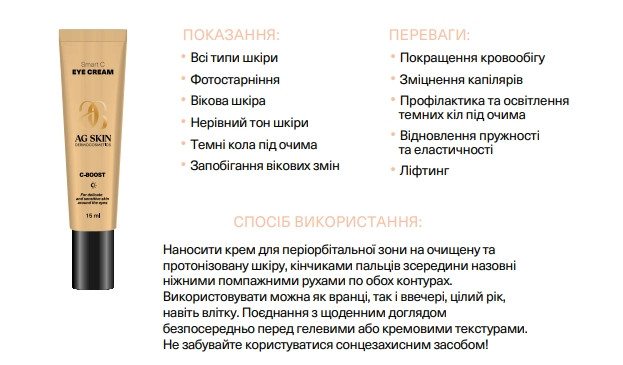 Завдяки цій комбінації інгредієнтів, Smart C Eye Cream не тільки зменшує темні кола під очима, але й забезпечує комплексний догляд, що сприяє зволоженню, зміцненню та омолодженню шкіри в зоні навколо очей.
