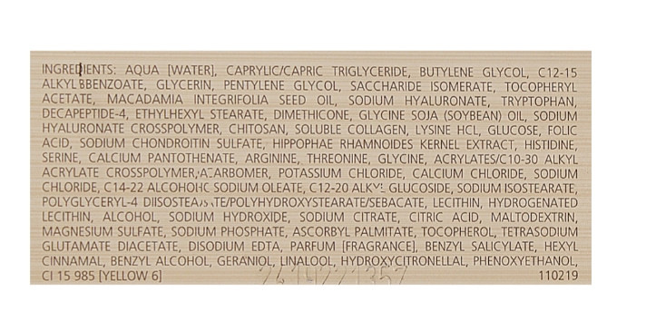 Активні компоненти: SkinNova SC Technology, олія макадамії, гіалуронова кислота, комплекс активних речовин з обліпихи, екстракт квітів конюшини, триптофан, пептидний комплекс, поперечно-зшита гіалуронова кислота, бісаболол, вітамін Е, сахариди, олігопептид-2 гліцин, серин, аргінін.