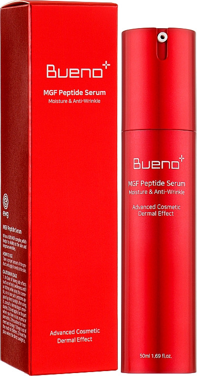 Пептидна сироватка проти зморшок Bueno MGF Peptide Serum містить високу концентрацію активних компонентів, спрямованих на боротьбу із віковими змінами шкіри. Зменшує глибину заломів та розгладжує зморшки, зменшує сіточку мімічних зморшок. Вирівнює рельєф шкіри, підвищує тургор, покращує еластичність.