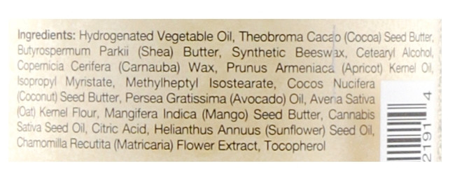 Активні компоненти: масло какао, масло ши, олія абрикосових кісточок, масло кокосу, олія авокадо, екстракт вівса, масло манго, олія коноплі, олія соняшника, екстракт ромашки, вітамін Е.
