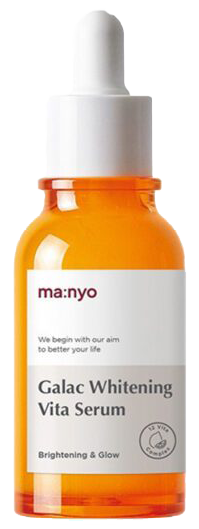 Антиоксидантна сироватка від Ma:nyo Galac Whitening Vita Serum на основі обліпихової води, вітамінів С, Е, В3 і галактомісісу вирівнює загальний тон шкіри і робить його більш однорідним, яскравим і сяючим, тонізує, прибирає сліди втоми та відлуння складного робочого дня або безсонної ночі, захищає шкіру від фотостаріння, а також бореться з дрібними недосконалостями, локальними висипаннями та вугровими висипами, прискорює процес загоєння та розсмоктування невеликих запалень, стягуючи пори та залишаючи красивий, глянсовий фініш на поверхні обличчя.
