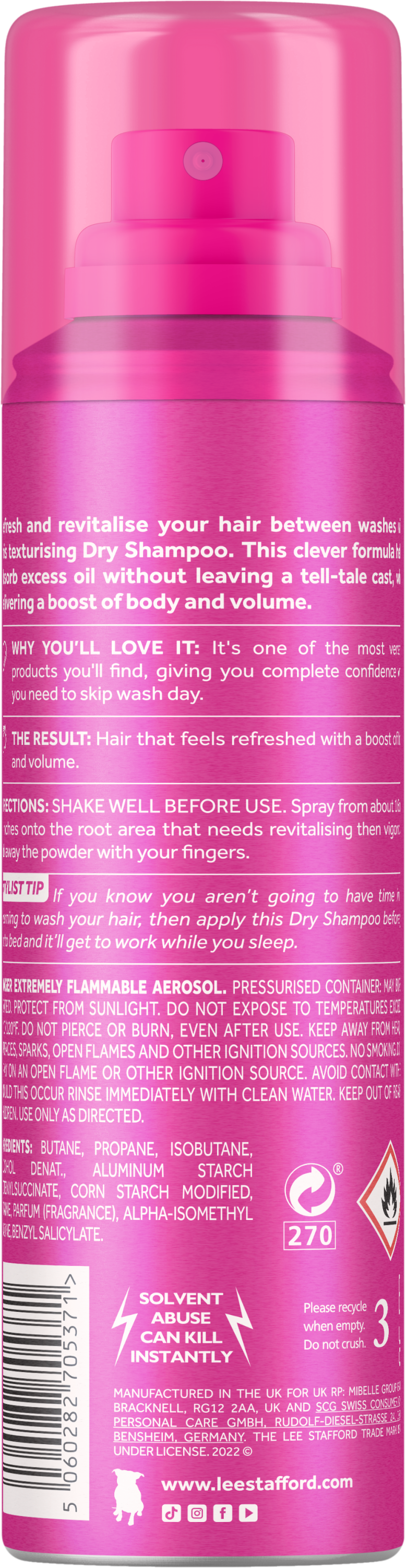 Сухий шампунь Lee Stafford містить кукурудзяний крохмаль, який вбирає жир з коренів волосся та шкіри голови. Просто нанесіть на корені, щоб миттєво освіжити волосся.