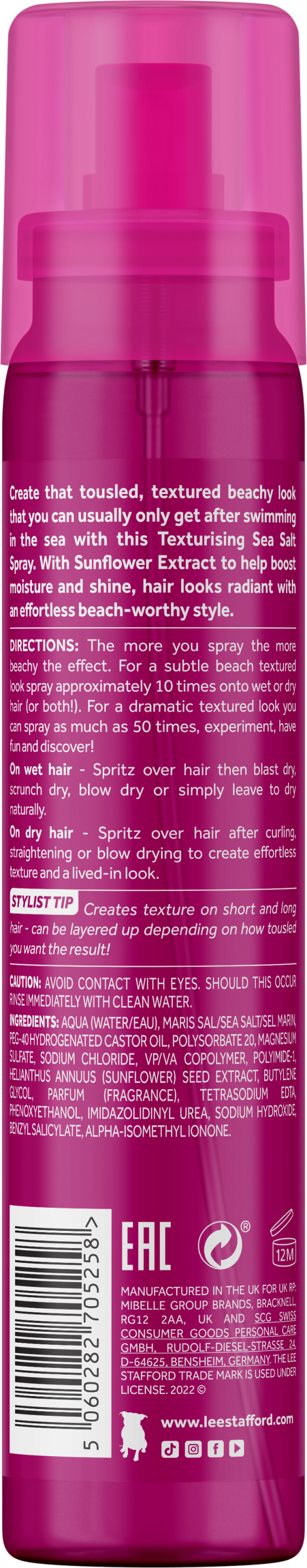 Вам не обов'язково бути на морі, щоб створити м'яке, вигоріле на сонці волосся, що так гарно дивиться на пляжі. Наш текстуруючий спрей з морською сіллю від Lee Stafford - це пляжні хвилі у пляшці. Призначений для використання як на вологому, так і на сухому волоссі; все, що вам потрібно зробити, - це розпилити спрей і розчесати!