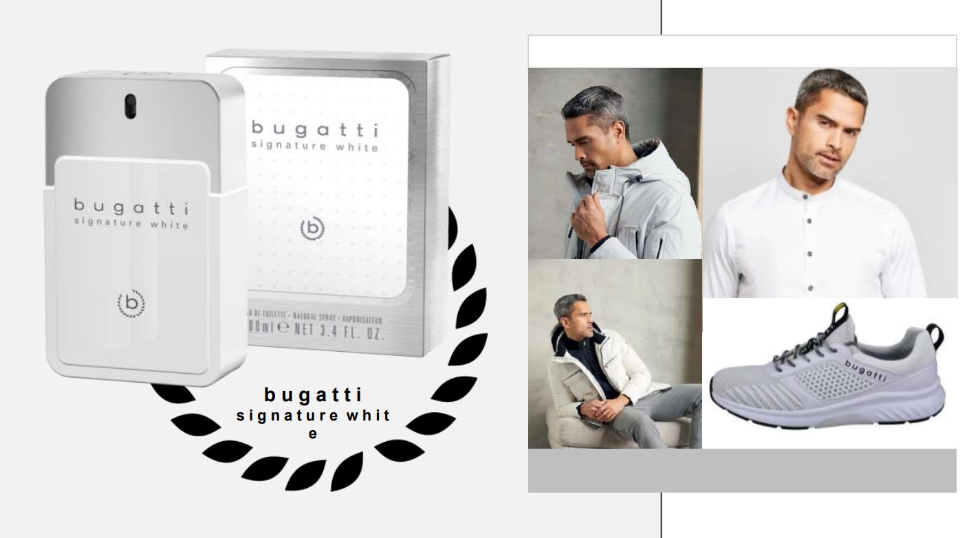 Білий це не тільки мінімалістичний колір поза часом, а і ідельний компонент для нескінченної кількості комбінацій, що випромінює відчуття легкості. Туалетна вода така ж позачасова, крутий і сучасний, як матовий флакон аромату знакового білого кольору bugatti. Аромат відкривається цитрусовими нотами бергамоту і лимону. Фруктово-зелену верхню ноту створюють солодка слива і зелене яблуко. Сильні пряні листя гвоздики поєднуються з теплою корицею в нотах серця, відкриваючись свіжим прохолодним ароматом герані і благородною димною нотою шафрану. Аромат завершується довготривалою базовою нотою дорогоцінного кедрового дерева та тепло-солодким аромат ванілі та амбри.