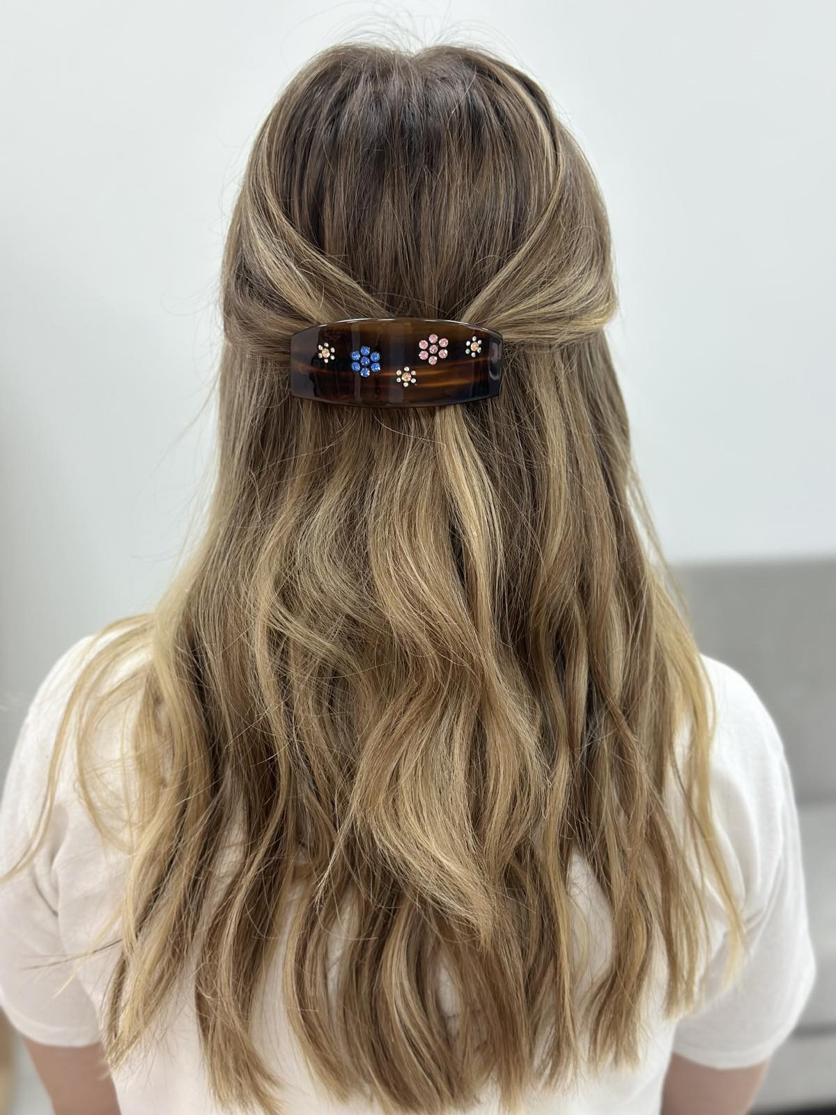Наша нова шпилька – класична та легка альтернатива еластичним гумкам для волосся. Цей тримач для кінського хвоста, виготовлений вручну зі 100% ацетату целюлози, має застібку-шпильку у французькому стилі, що робить його ідеальним рішенням для укладання волосся будь-якого типу.
