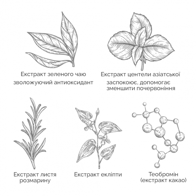 Антиоксиданти: Такі інгредієнти, як вітамін Е та екстракт зеленого чаю, допомагають захистити шкіру від окисного стресу і шкідливого впливу навколишнього середовища.