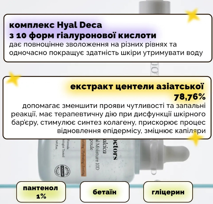 Сироватка Doctors Hyalcica Total Moisture 10 D Ampoule, 50 мл на основі екстракту центели та гіалуронової кислоти об’єднала в собі краще з двох світів: абсолютний релакс-ефект при підвищеній чутливості та глибоке зволоження для зневодненої спраглої шкіри. Невагома гелева текстура легко розподіляється та миттєво повертає пружність, тонус, розправляє заломи, усуває відчуття сухості, робить шкіру зволоженою та еластичною.