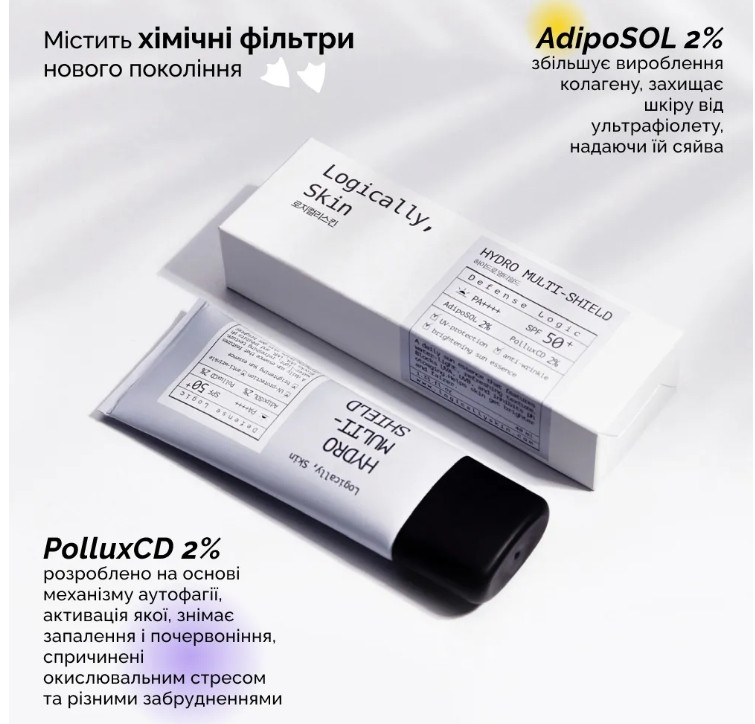 Крем містить інноваційні компоненти Акватайд 1%, Адипосол 2% та ПоллюксСД 2% - таким чином крем буде слугувати не лише, як захист від сонця, але й підтримуватиме шкіру в свіжому та красивому стані, оскільки Адипосол сповільнує процес старіння шляхом активації аутофагії (процес, за якого клітини себе частково перетравлюють, це дозволяє клітині «оновитися»), запобігає втраті колагену, Акватайд 5000 надає зволоженя клітин шкіри, а ПоллюксСД – захищає шкіру від забрудненого повітря.