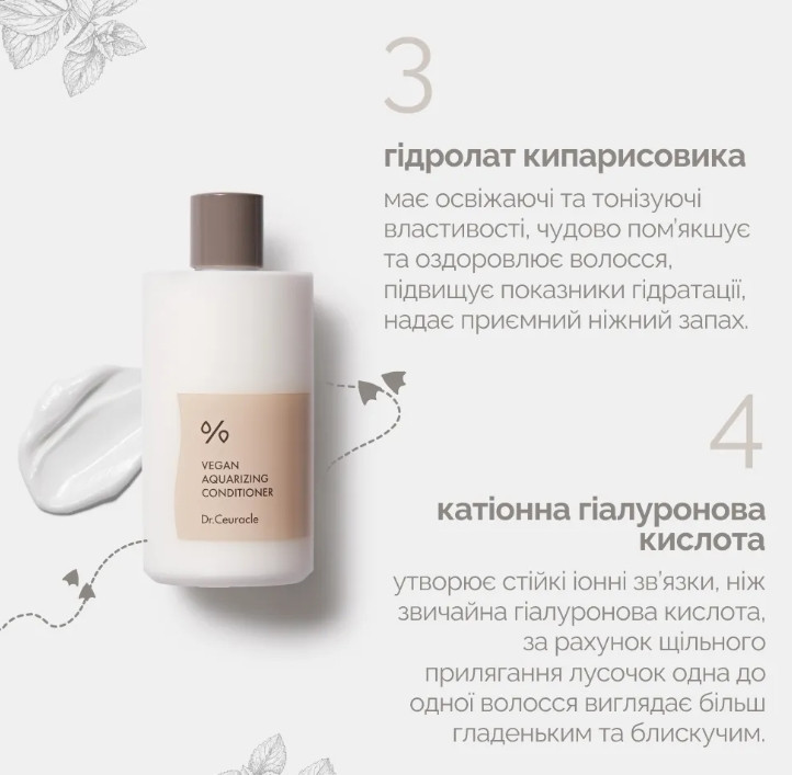 Зволожувальний кондиціонер без силіконів доповнить догляд за неслухняним, тонким, пористим волоссям, та складе ідеальну пару шампуню з лінійки веганських засобів Dr.Ceuracle Vegan Aquarizing. Він має густу кремову текстуру, що огортає кожну волосинку, чудово пом’якшує, розплутує, надає гладкості та блиску, зберігає природню красу та легкість.