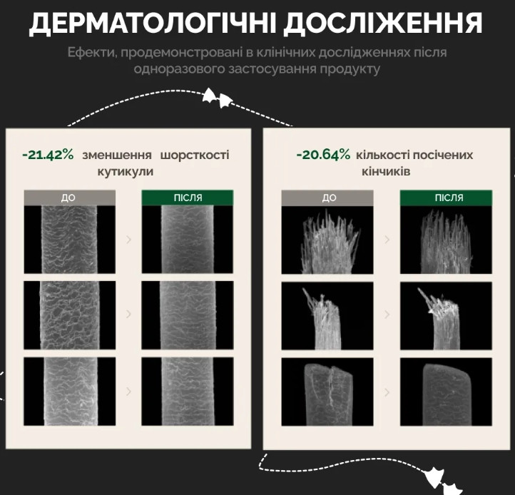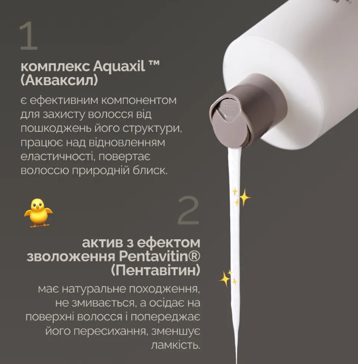Щоб зробити волосся знову пружним, еластичним та дисциплінованим, полегшити вологе та сухе розчісування, зменшити електризацію, до складу формули входять емульгатори рослинного походження в поєднанні з полімерами. Живильні олії аргани та жожоба насичують кожне пасмо корисними речовинами, повертають м’якість, а також запобігають втраті дорогоцінної вологи.