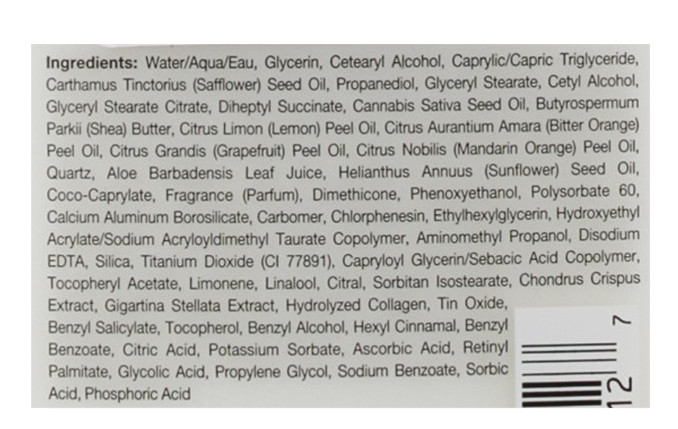 Активные компоненты: масло конопли, масло ши, масло лимона, масло апельсина, масло грейпфрута, масло мандарина, кварц, сок алоэ барбаденсис, подсолнечное масло.