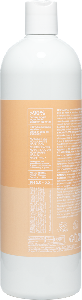 - биоожиженный красный виноград: обеспечивает волосам питание, укрепляет его и придает блеск. Действует как мощный антиоксидант, увлажняет волосы и кожу головы, поддерживая их в здоровом состоянии. Улучшает внешний вид волос благодаря своим антивозрастным свойствам.