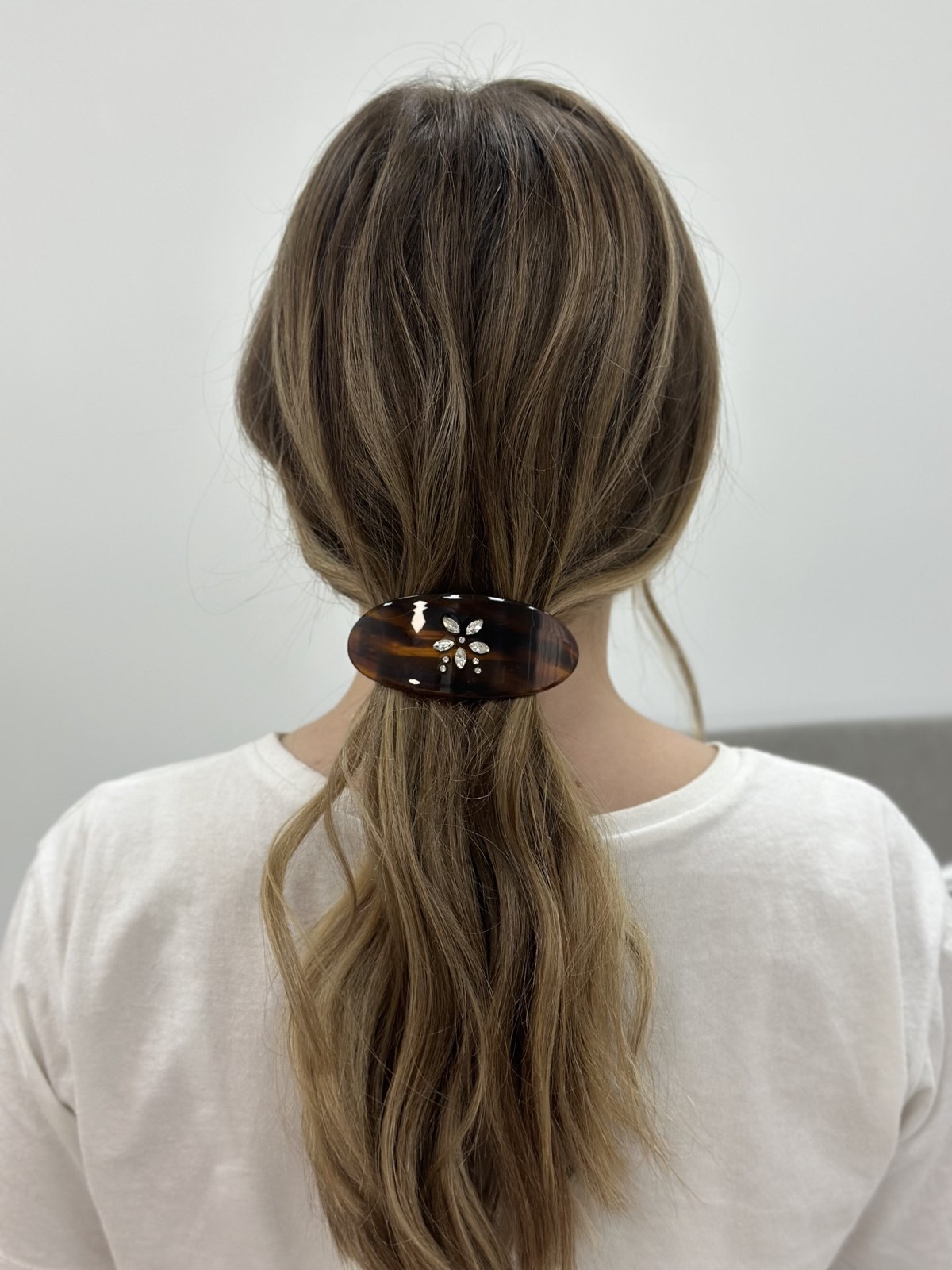 Наша новая заколка – классическая и легкая альтернатива эластичным резинкам для волос. Этот держатель для конского хвоста, изготовленный вручную из 100% ацетата целлюлозы, имеет застежку-шпильку во французском стиле, что делает его идеальным решением для укладки волос любого типа.